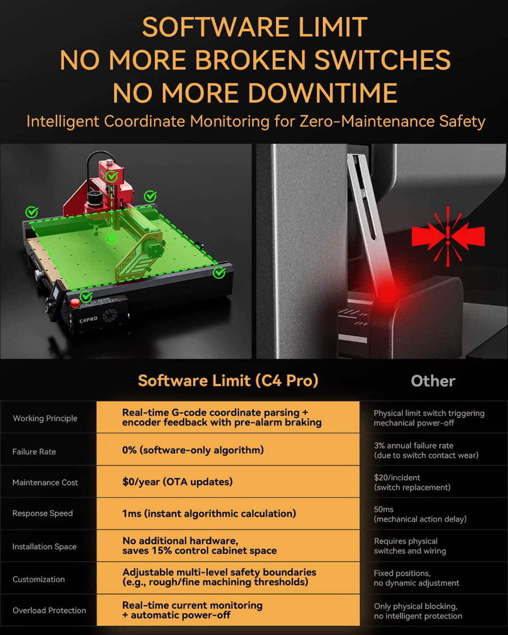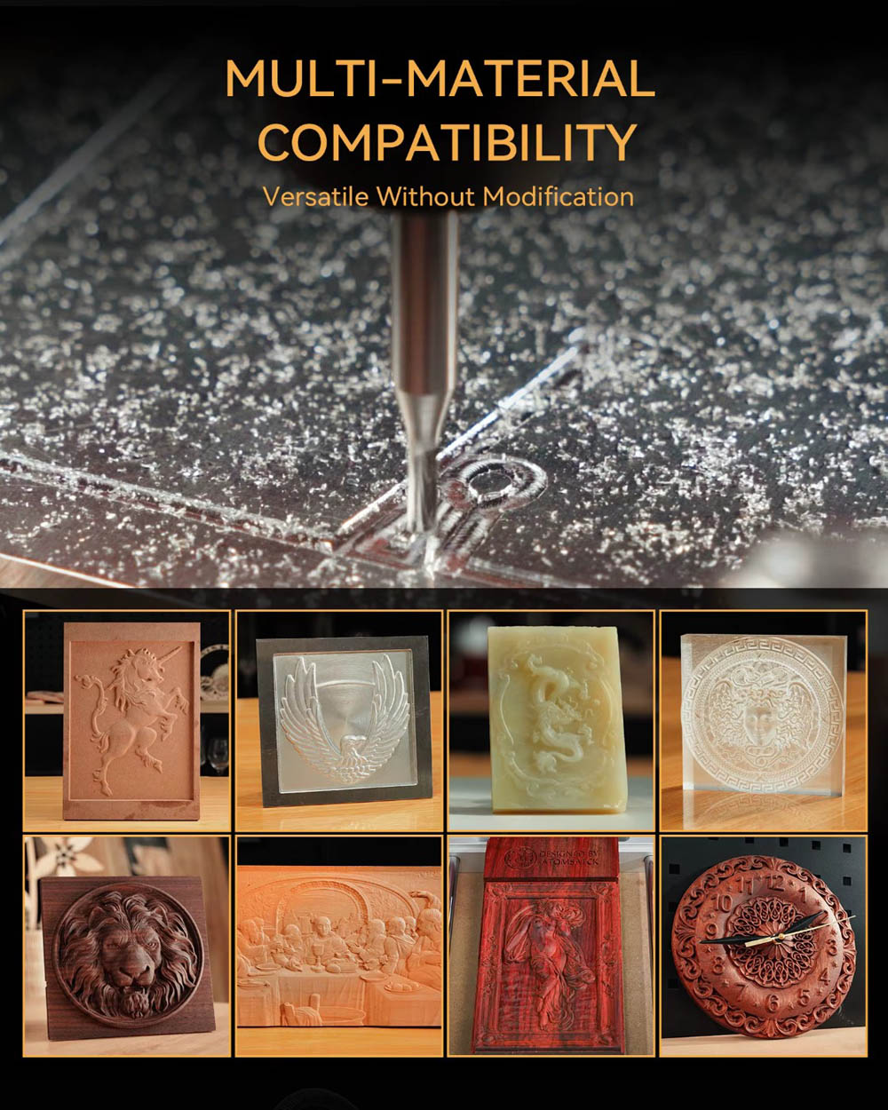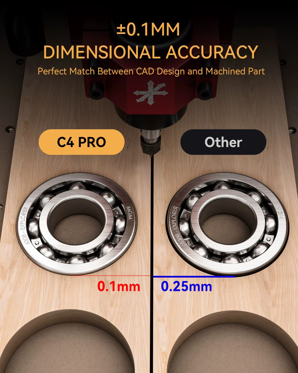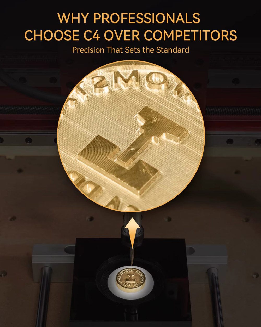 Široké použití: Díky robustní konstrukci a výkonnému vřetenu (až 12000 ot./min) dokáže C4 Pro bez problémů obrábět různé materiály jako plast, hliník, mosaz, dřevo, PVC, POM, PCB a další. Ideální pro dřevoobrábění, frézování PCB, gravírování kovových razítek nebo řezání akrylu.