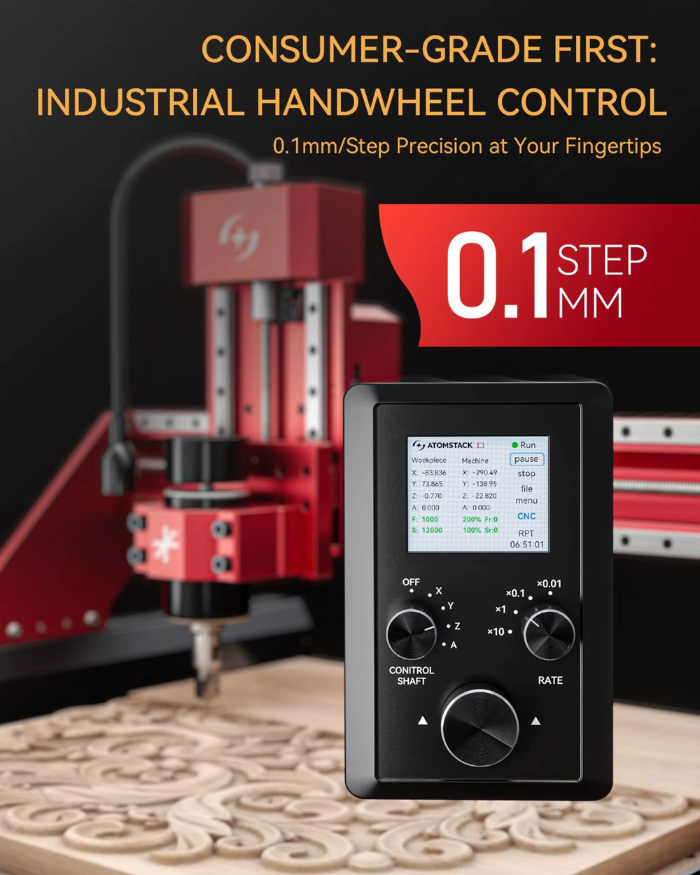 Offline řízení průmyslového standardu: AtomStack C4 Pro je vybavena proprietárním průmyslovým offline kontrolérem s otočným ovladačem. Umožňuje sledovat a korigovat polohu a zblízka monitorovat stav vřetena – pro zážitek typický pro průmyslové stroje.