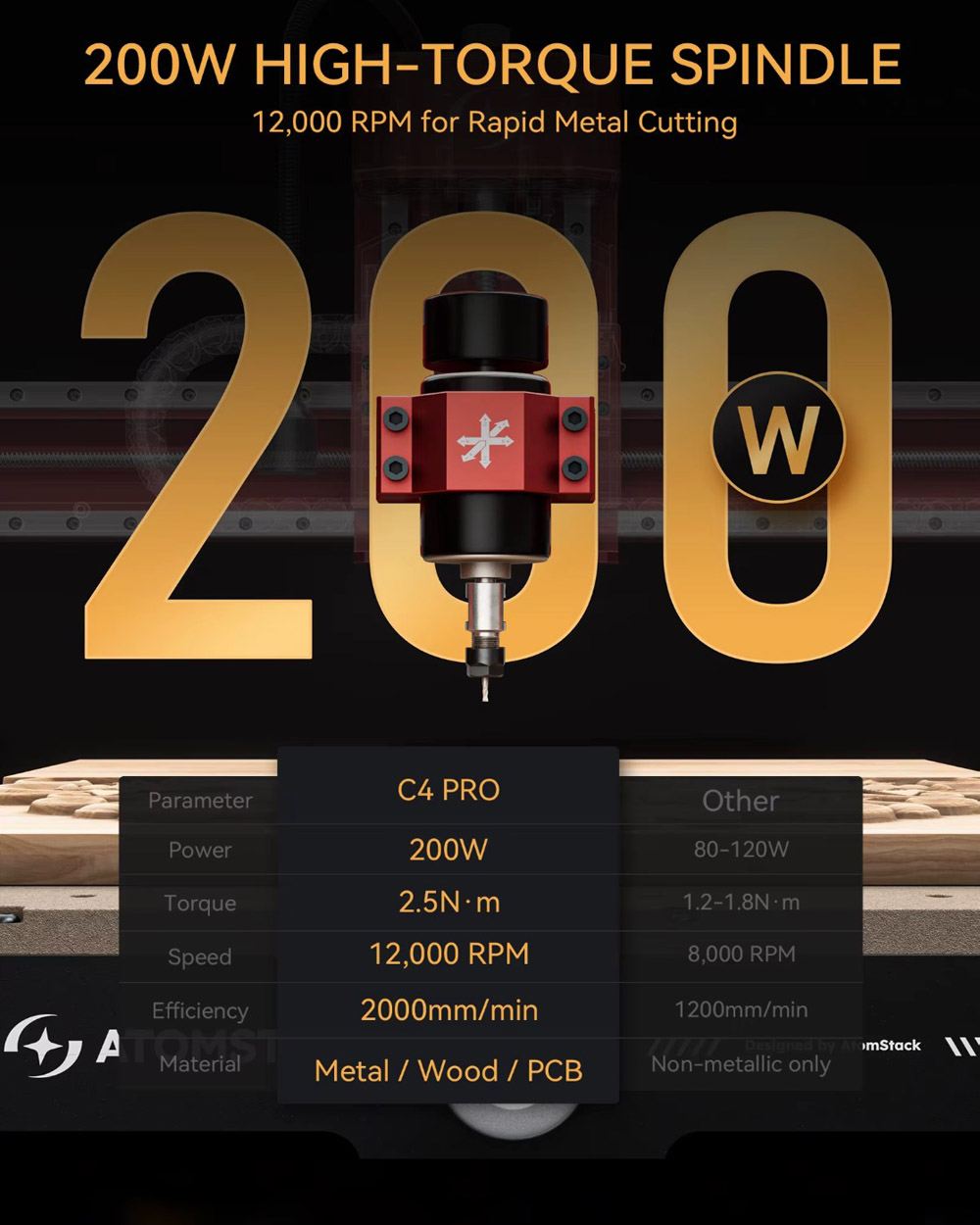 Je vybavena vřetenem 200 W s maximálními otáčkami 12000 ot./min – umožňuje práci s mnoha materiály: dřevo, PCB, akryl, hliník a mnoho dalších.
