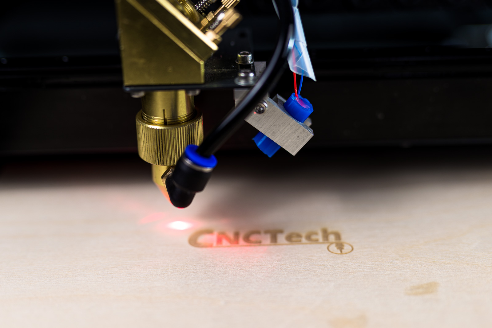 Funkce ofukování hlavice "Air Assist" - na přiloženém obrázku lze vidět, že se jedná o tovární instalaci - vzduch vychází přímo ze stejného otvoru jako laserový paprsek - to výrazně zlepšuje výsledky při práci s různými materiály, které vyžadují ofukování.