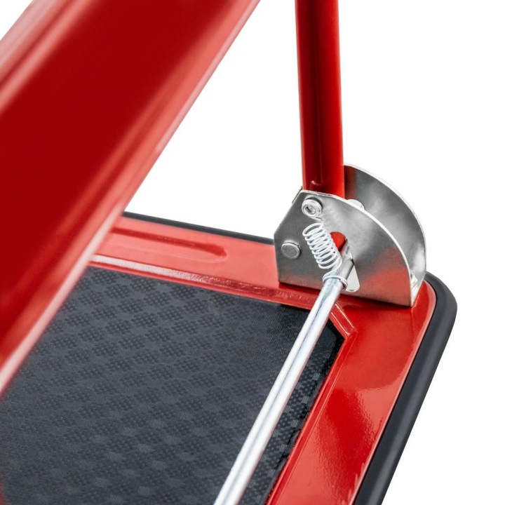 Přepravní vozík HIGHER je vybaven jednoduchým a osvědčeným pružinovým systémem pro sklápění a rozkládání madla. Sklápění se ovládá sešlápnutím páky nohou (bez ohýbání), což trvá 2-3 sekundy. Je to praktické a odolné řešení. Díky použití oceli a pozinkovaných prvků je tento systém velmi odolný vůči mechanickému poškození a povětrnostním vlivům.